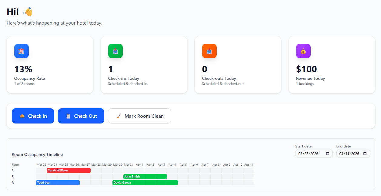 Quick access to all daily operations including check in, check out, and marking clean rooms